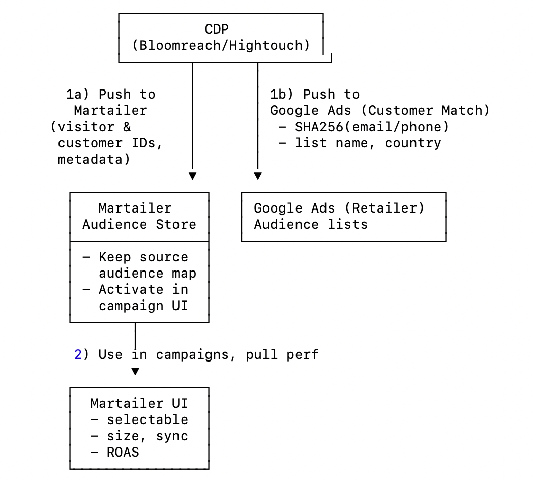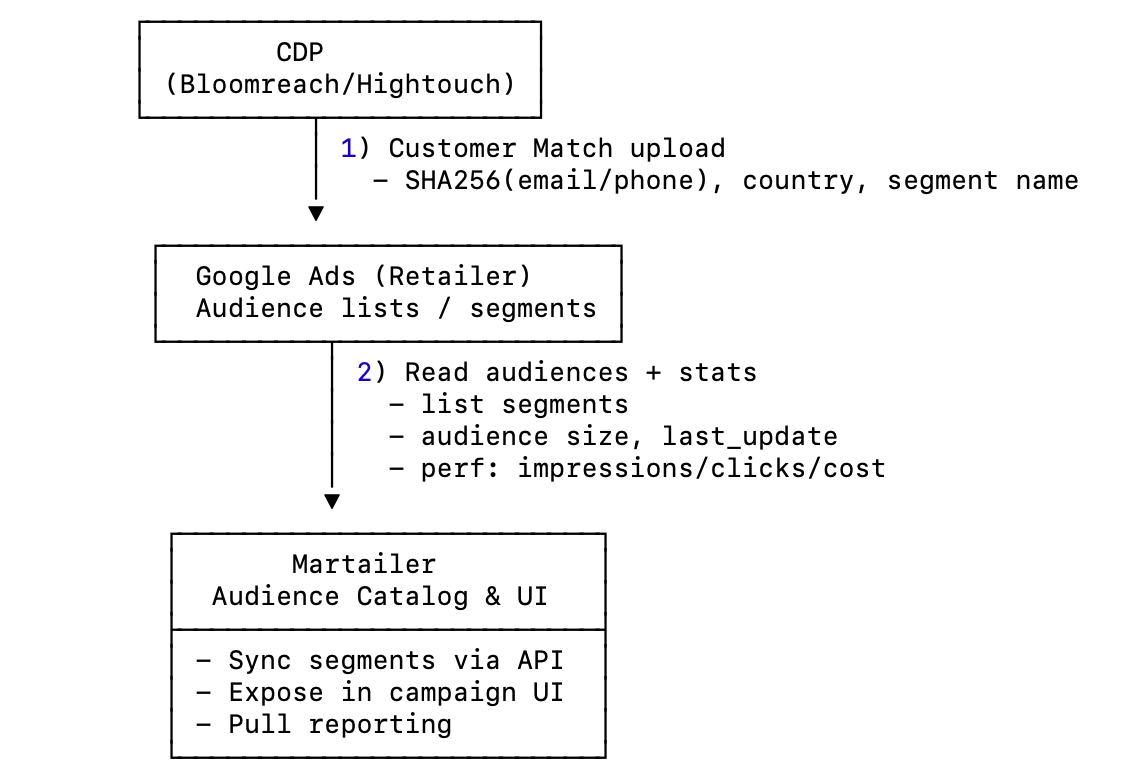 When the retailer’s CDP pushes Customer Match lists directly to Google Ads, Martailer simply reads those lists for selection. No user identifiers are stored in Martailer. The flow works like this: